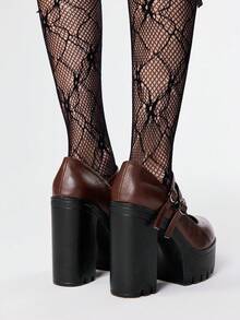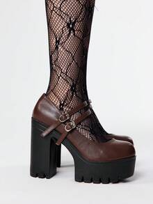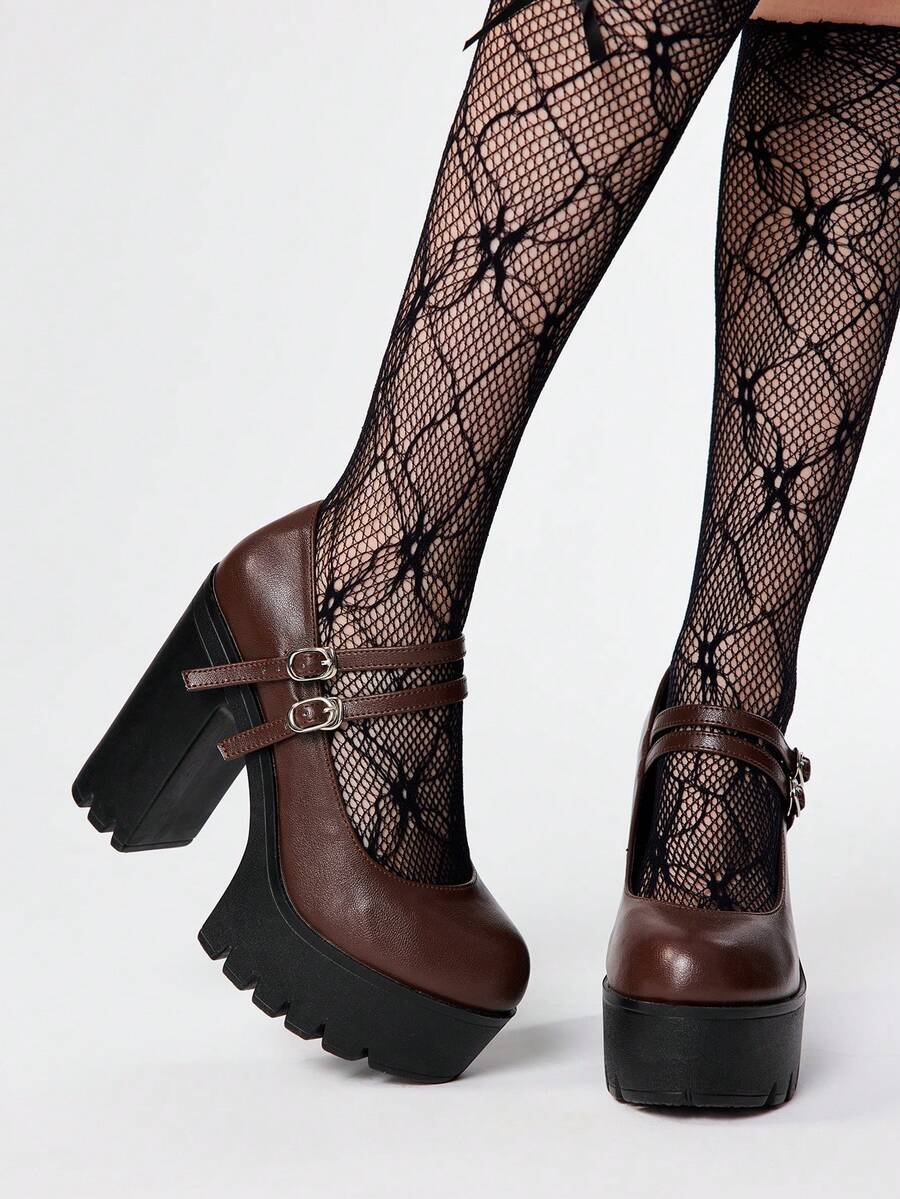 Goth Scarpe con tacco alto donna, con suola spessa e tacco chunky, di moda per primavera/autunno, colore unito, con doppia fibbia scarpe Mary Jane con tacco alto