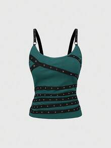 Grunge Punk Canotta da donna sexy senza maniche con spalline sottili, scollo profondo, nera, con borchie, cristalli e nastri, adatta per spiaggia estiva, laurea, Pasqua, concerti, vacanze a Nashville, festival musicali, rock