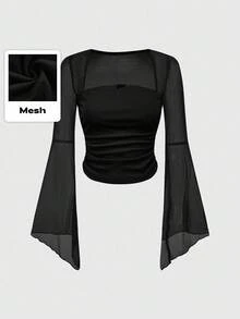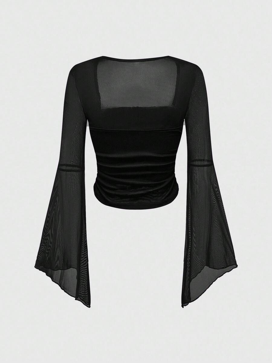Camicia a maniche lunghe in rete trasparente di colore unito e stile minimalista per donna
