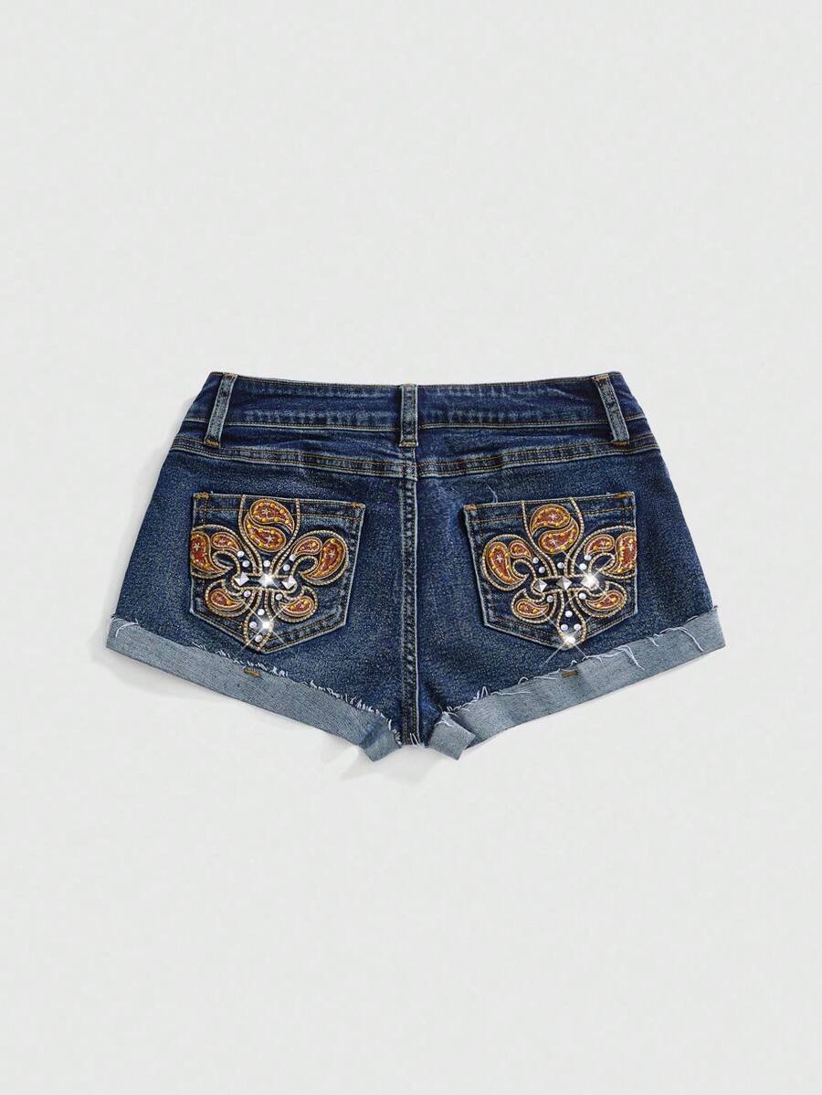 Hippie Pantaloncini di jeans vintage da donna con vita bassa, stile hippy, ricamati a paisley, con borchie, adatti per vacanze