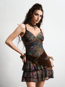 Hippie Abito corto senza maniche con stampa floreale vintage e decorazione con frange, moda estiva per donne