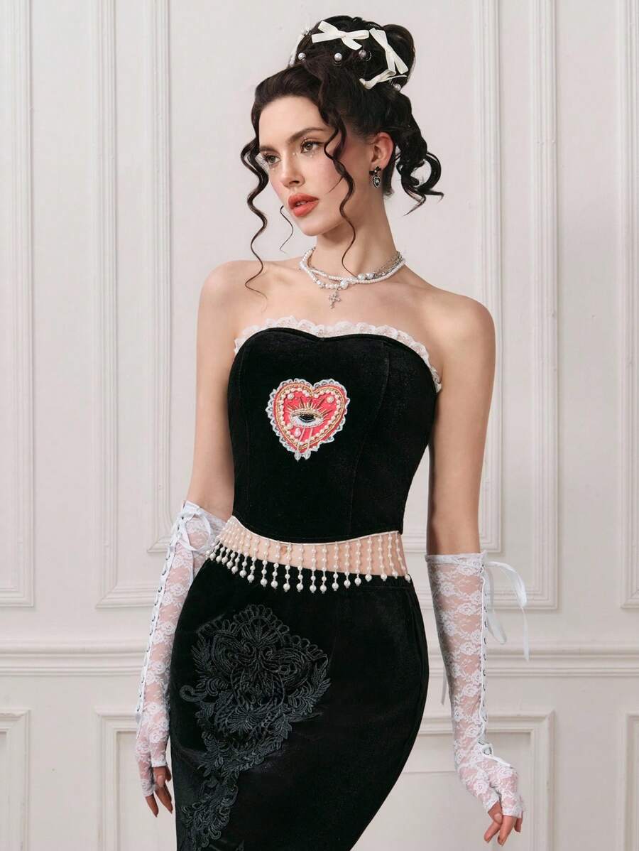 EDITION Top alla halter con ricamo di occhi a cuore barocchi vintage, finitura in pizzo a contrasto colore, con perle e nappe