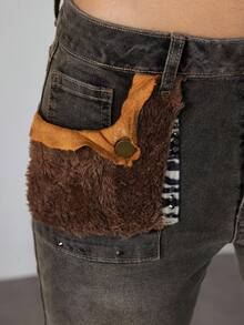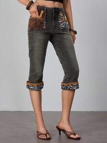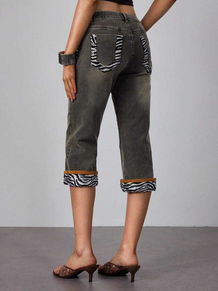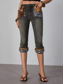J-Fashion Jeans a vita bassa con vita alta, orlo a polsino con motivo a patchwork in zebre prent per donne