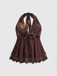 Top alla moda con stampa a ramoscello, con schiena scoperta e collo alto, per taglie forti