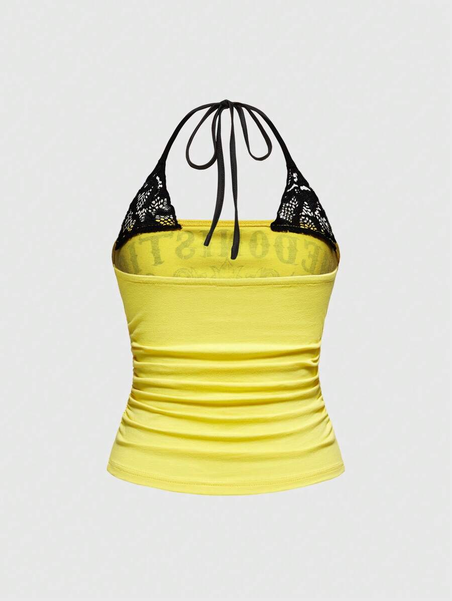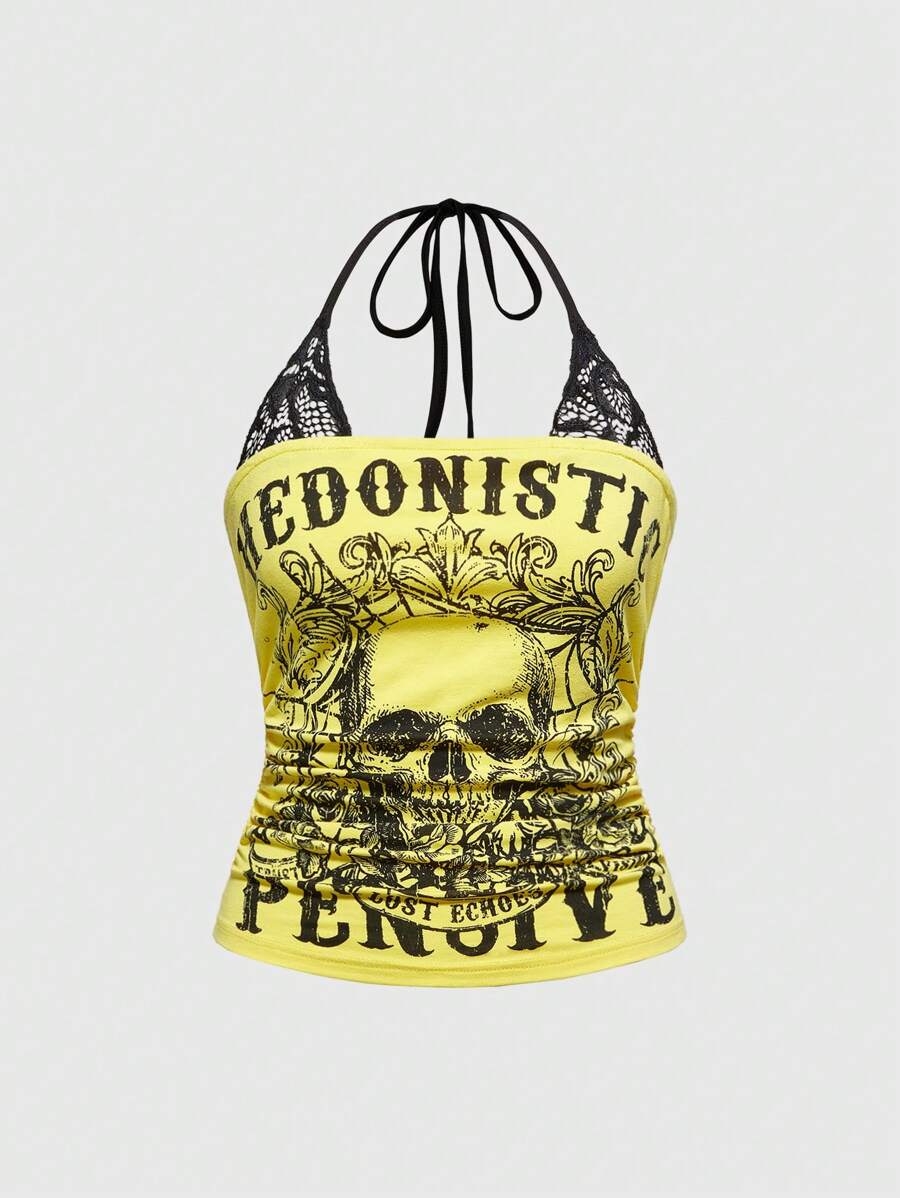 Grunge Punk Top corto da donna stile Y2K, a fantasia con teschi, da concerto o festival musicale, in cotone con inserto in pizzo a contrasto, a canotta