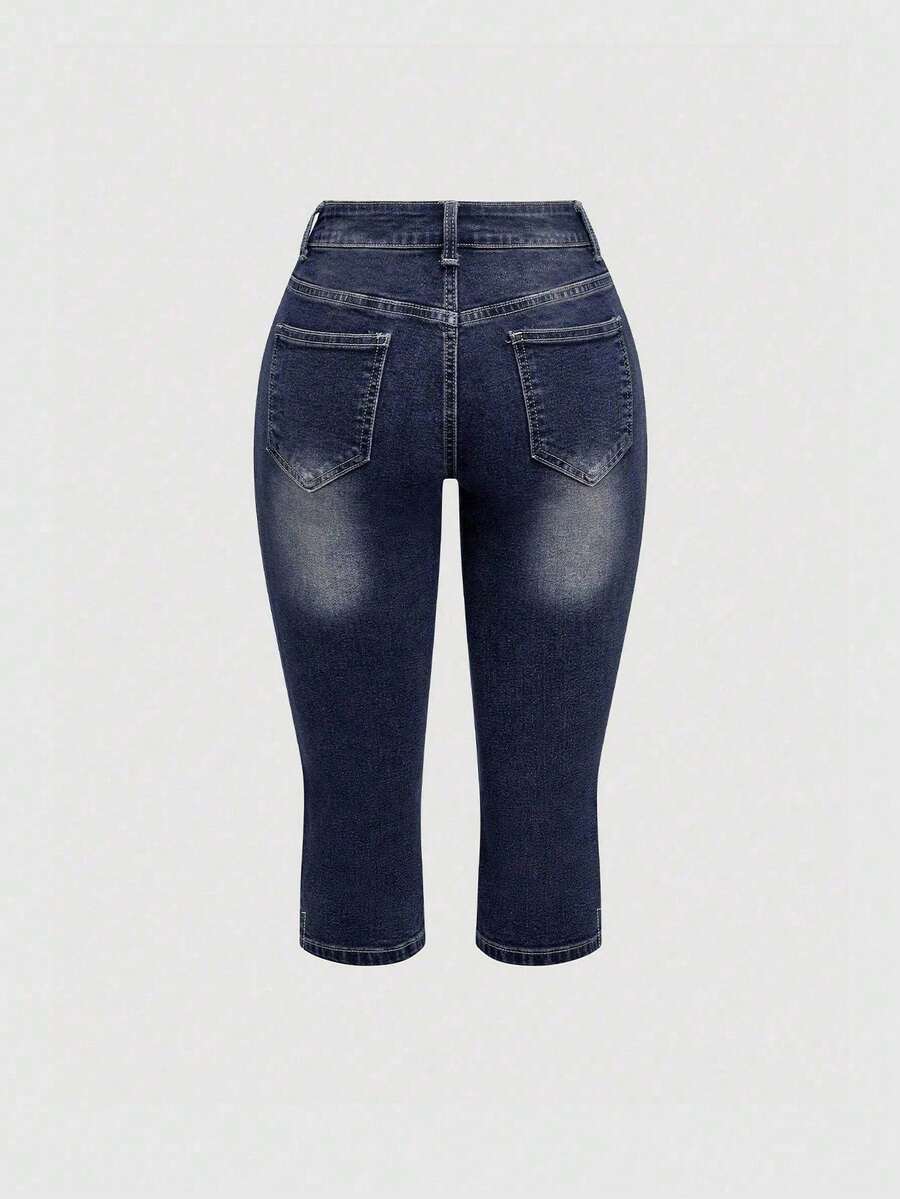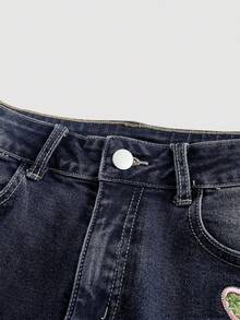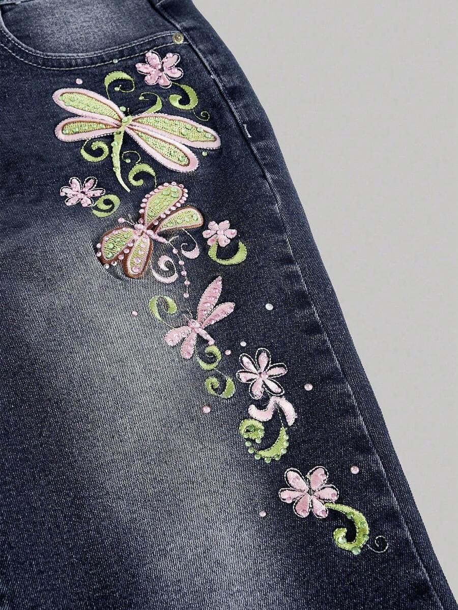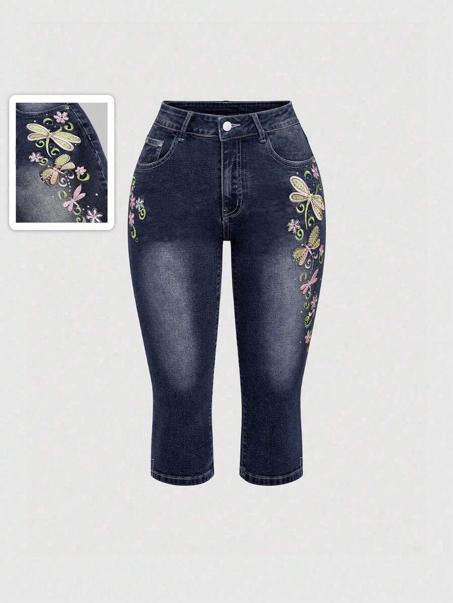 Fairycore Jeans a vita super bassa a 3/4 da donna in stile retrò Y2K con ricamo di libellule