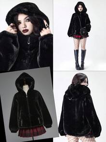 Giacca con cappuccio in stile punk scuro con chiusura lampo e finta pelliccia, da donna, per autunno/inverno