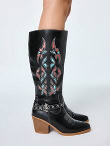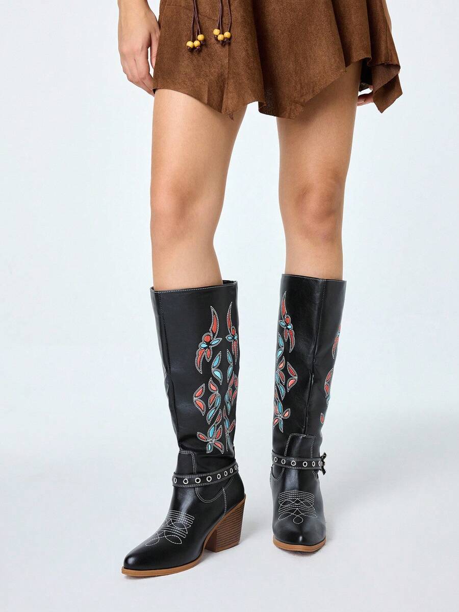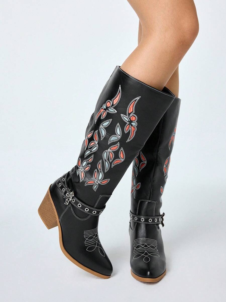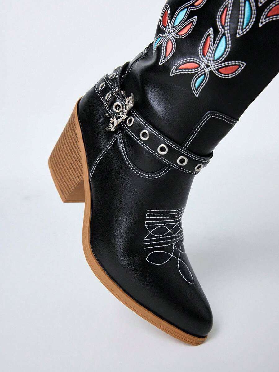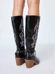 Stivali western neri da donna, stivali gotici con fibbia a cintura rock scura, stivali alti da cavaliere con ricamo slip-on, stivali da moto in pelle con tacco basso, stivali al polpaccio