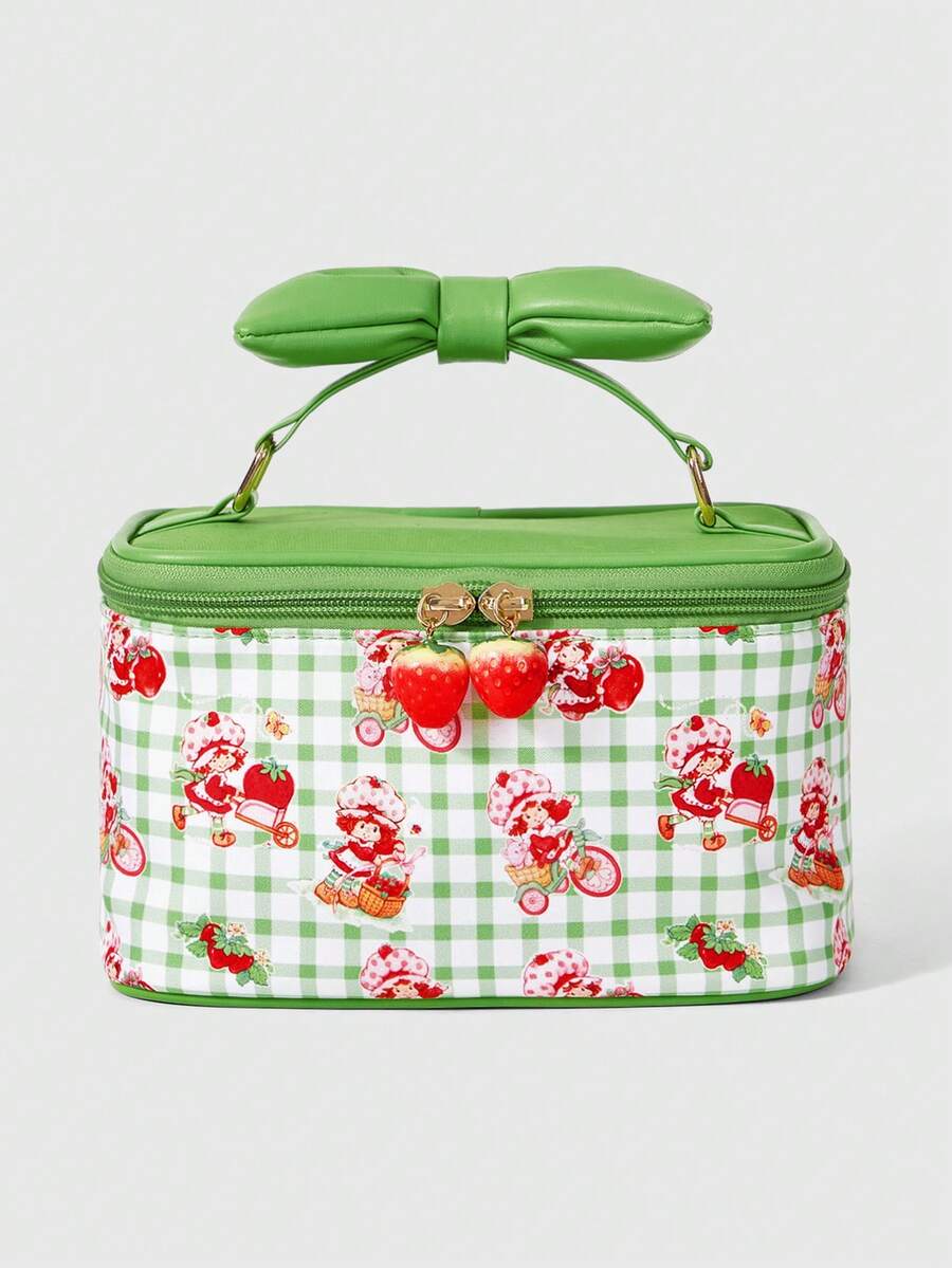 Borsa cosmetica portatile con manico, imbottita, con motivo a cartone animato carino e fiocco per le donne
