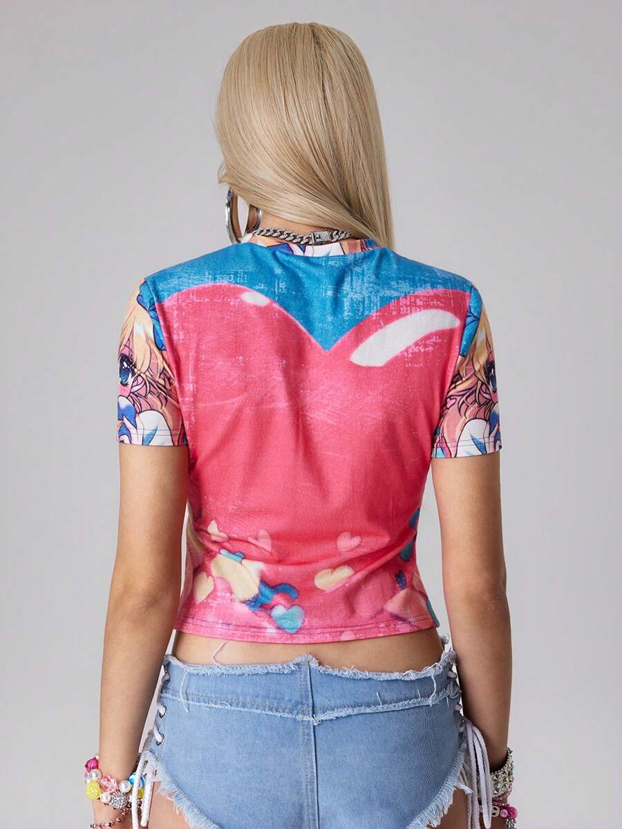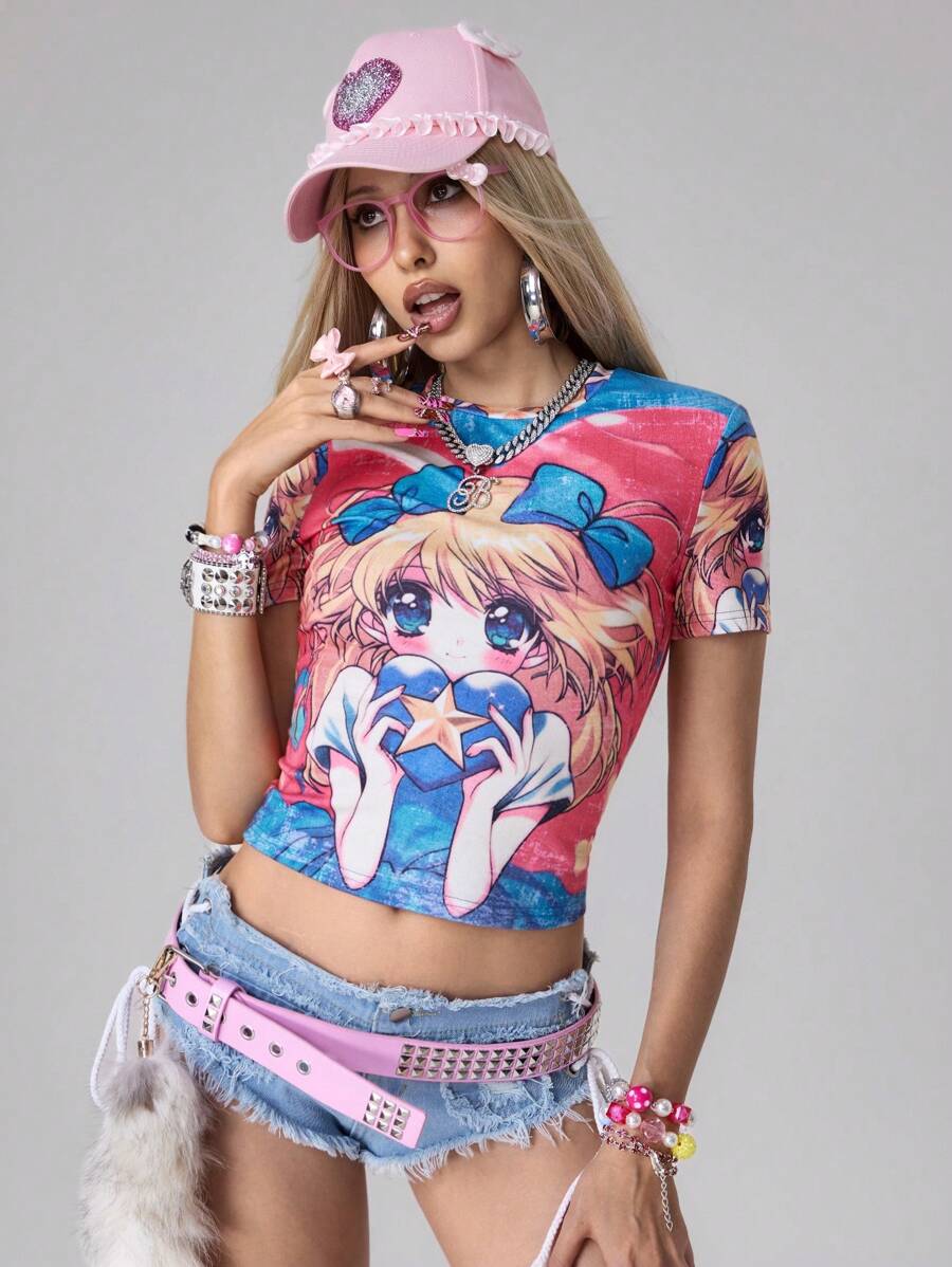 Maglietta corta con grafica di ragazza anime retrò carina da donna