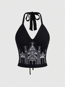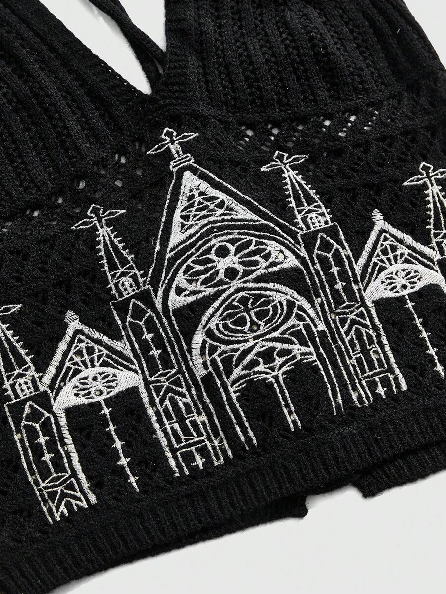 Goth Maglia a collo alto lavorata a maglia con ricamo di castello gotico per donna
