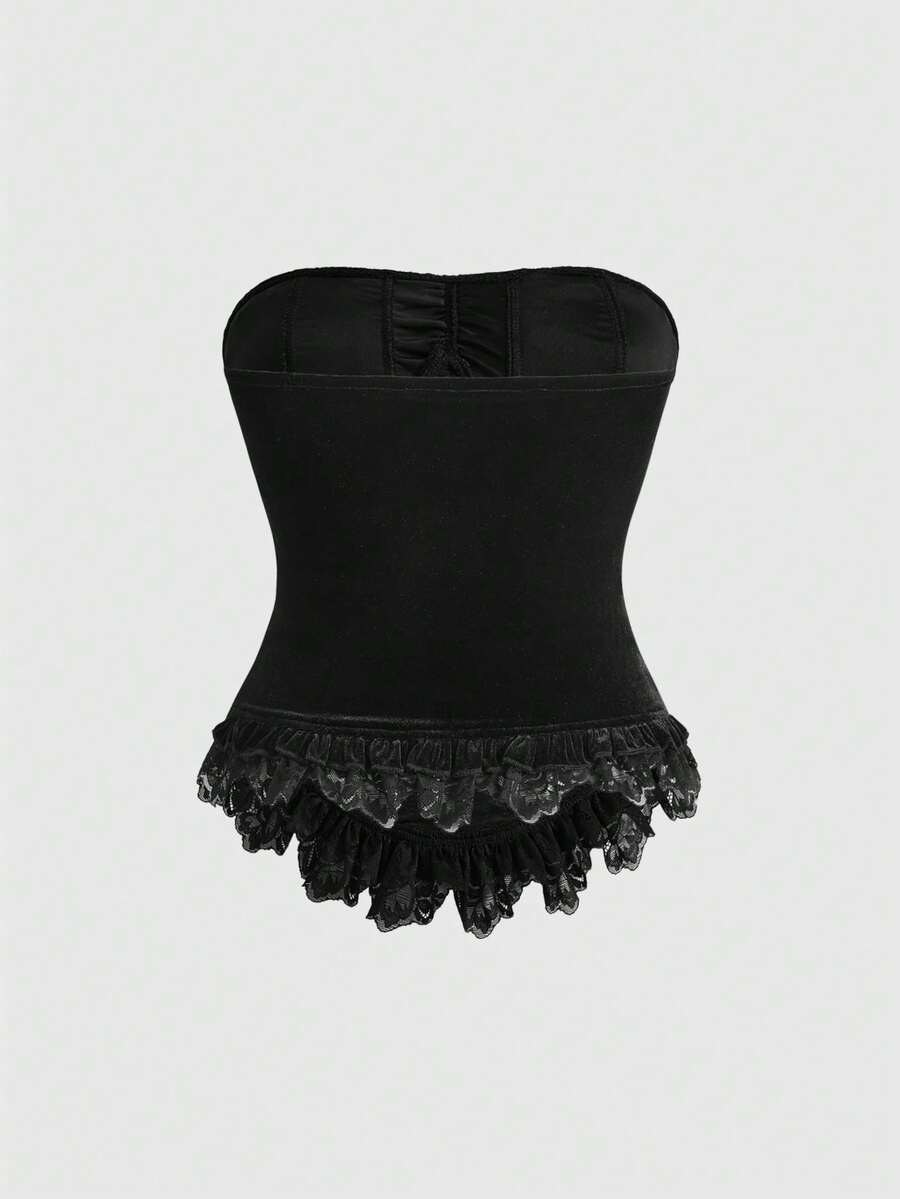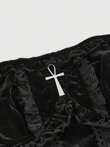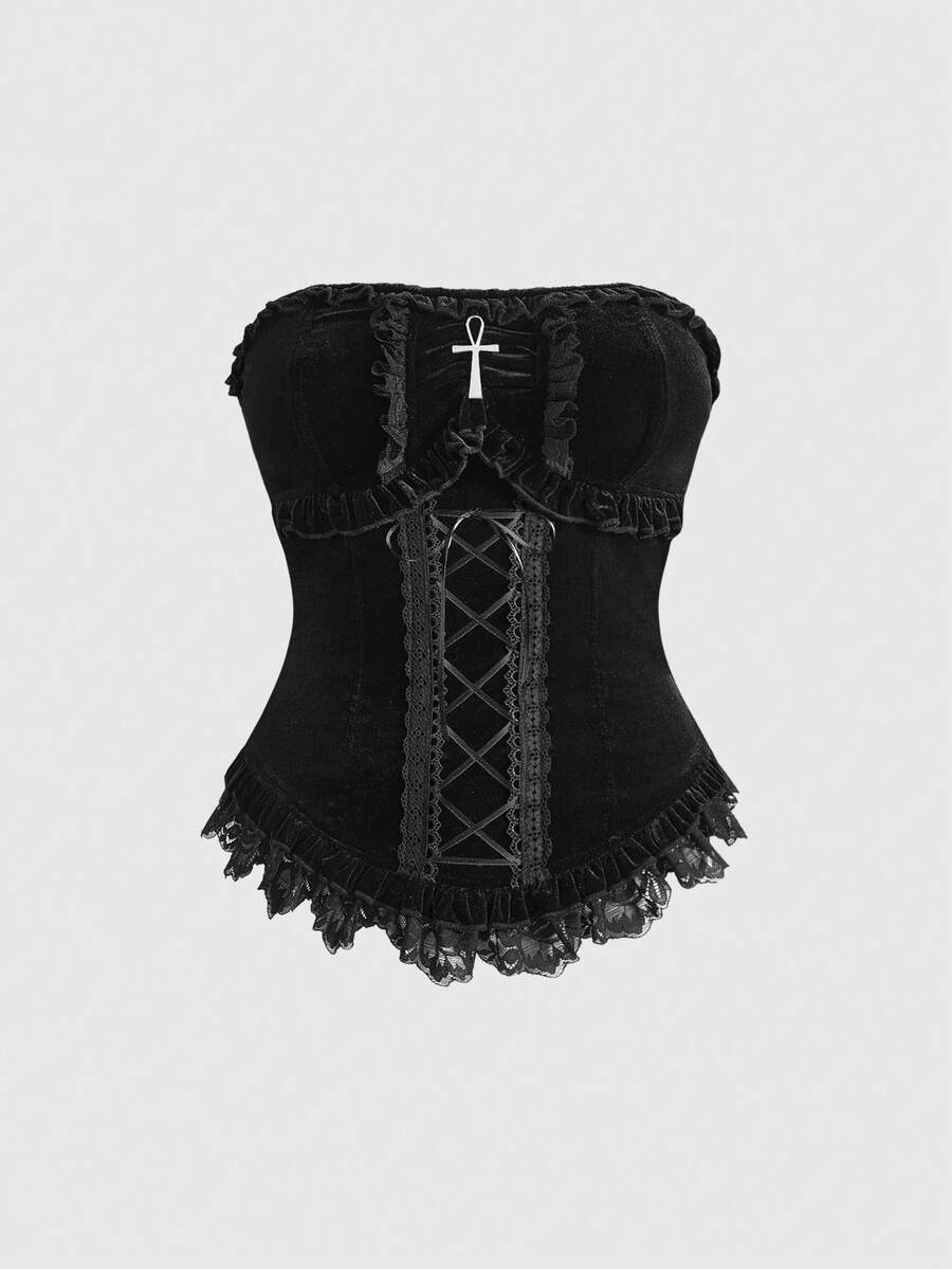 Goth Canotta gotica elegante da donna in velluto con inserti in pizzo, con lacci in vita e pendente a croce