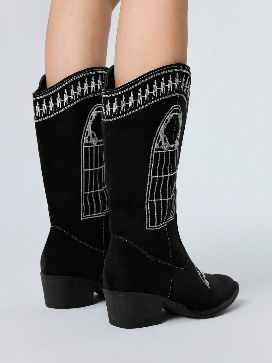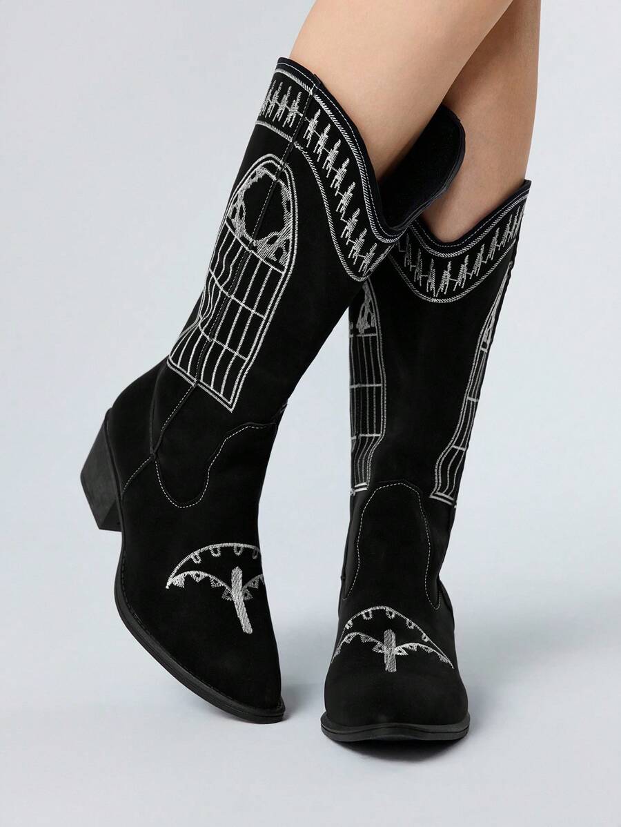 Goth Stivali da cowboy western con ricamo gotico punk, scollo a V, tacco spesso, stivali alti alla caviglia, adatti per Ognissanti