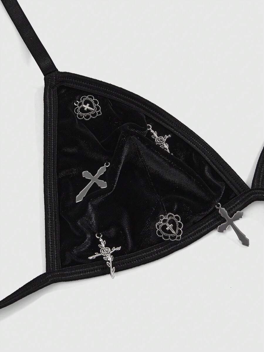 Goth Reggiseno gotico punk da donna con pendente a croce in pelliccia sintetica