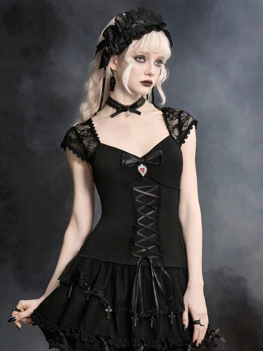 Maglietta da donna a maniche corte con pendente gotico vintage, maniche a contrasto in pizzo e coulisse
