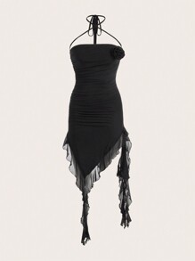 Abito da donna con spalline, con fiori 3D e orlo asimmetrico arricciato, adatto per la scuola