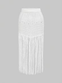 Gonna casual da spiaggia romantica da donna, stile hippie, in maglia all'uncinetto con frange