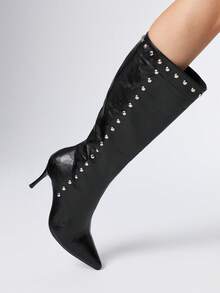 Stivali alti sopra il ginocchio da donna con punta affusolata, tacco a spillo e borchie, colore nero