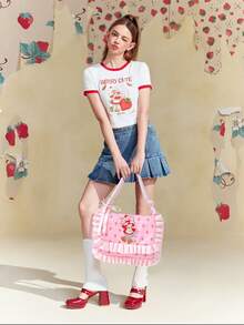 Borsa a spalla da donna con volant rosa, decorata con motivi carini a cartoni animati e fragole