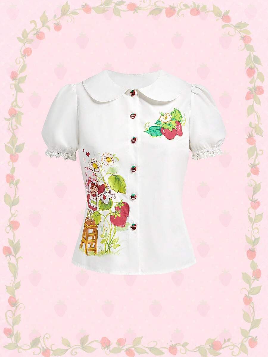 Blusa da donna con maniche a sbuffo, colletto Peter Pan, vita stretta, con grafica di figure cartoni animati e inserti in pizzo a contrasto