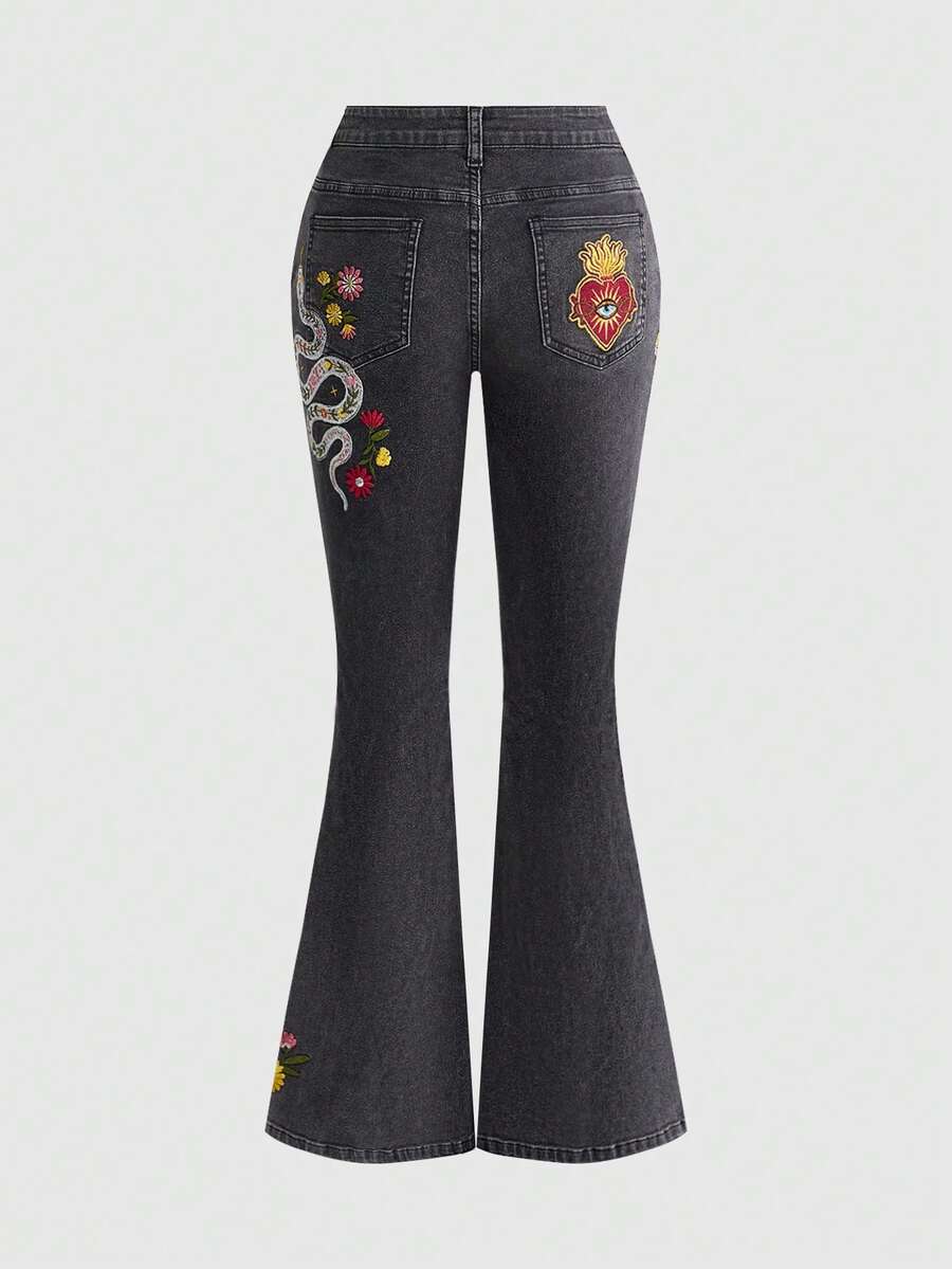 Goth Jeans a vita bassa a zampa d'elefante con ricamo retrò gotico di serpente, falena e occhio a cuore per donne