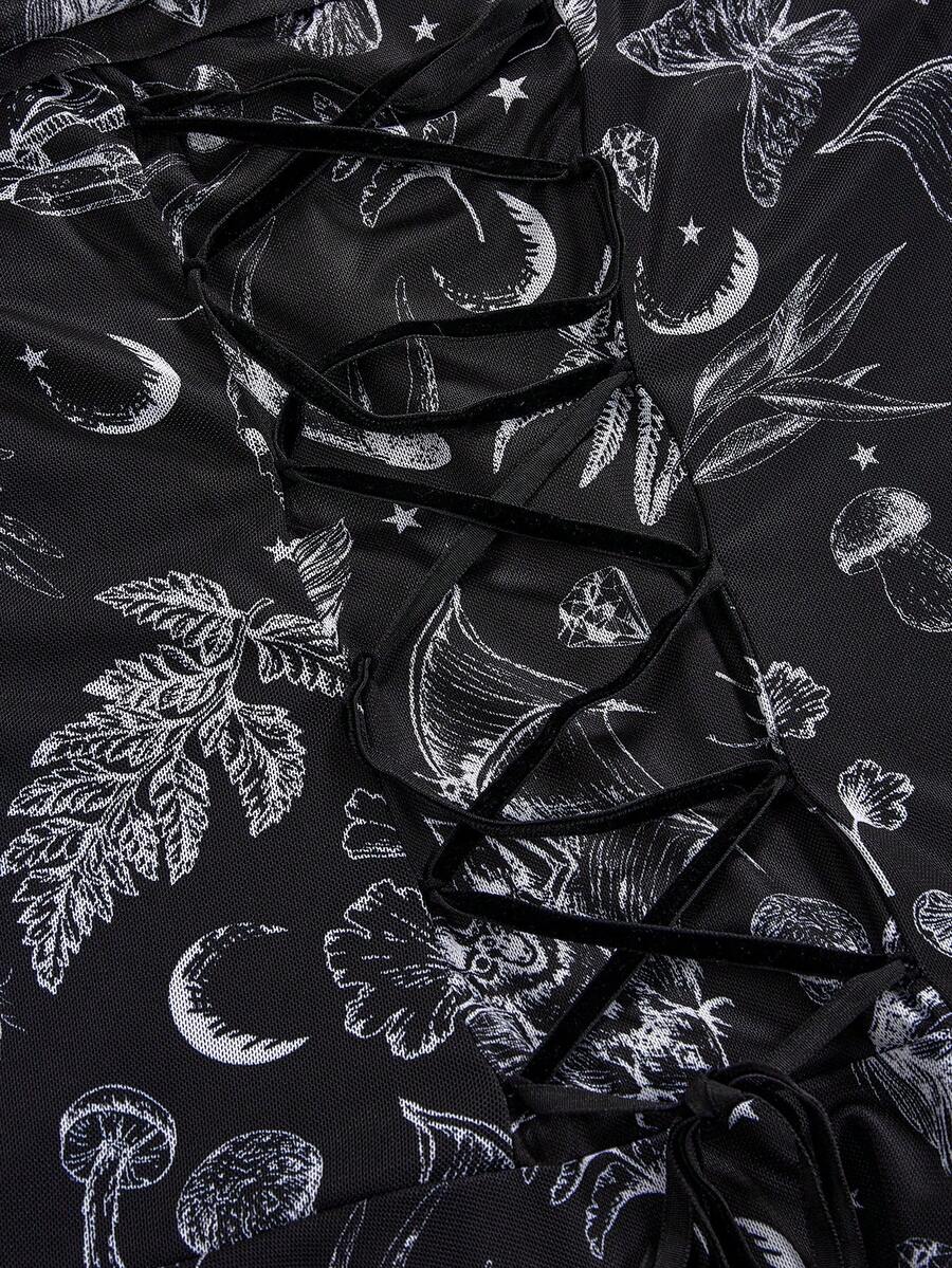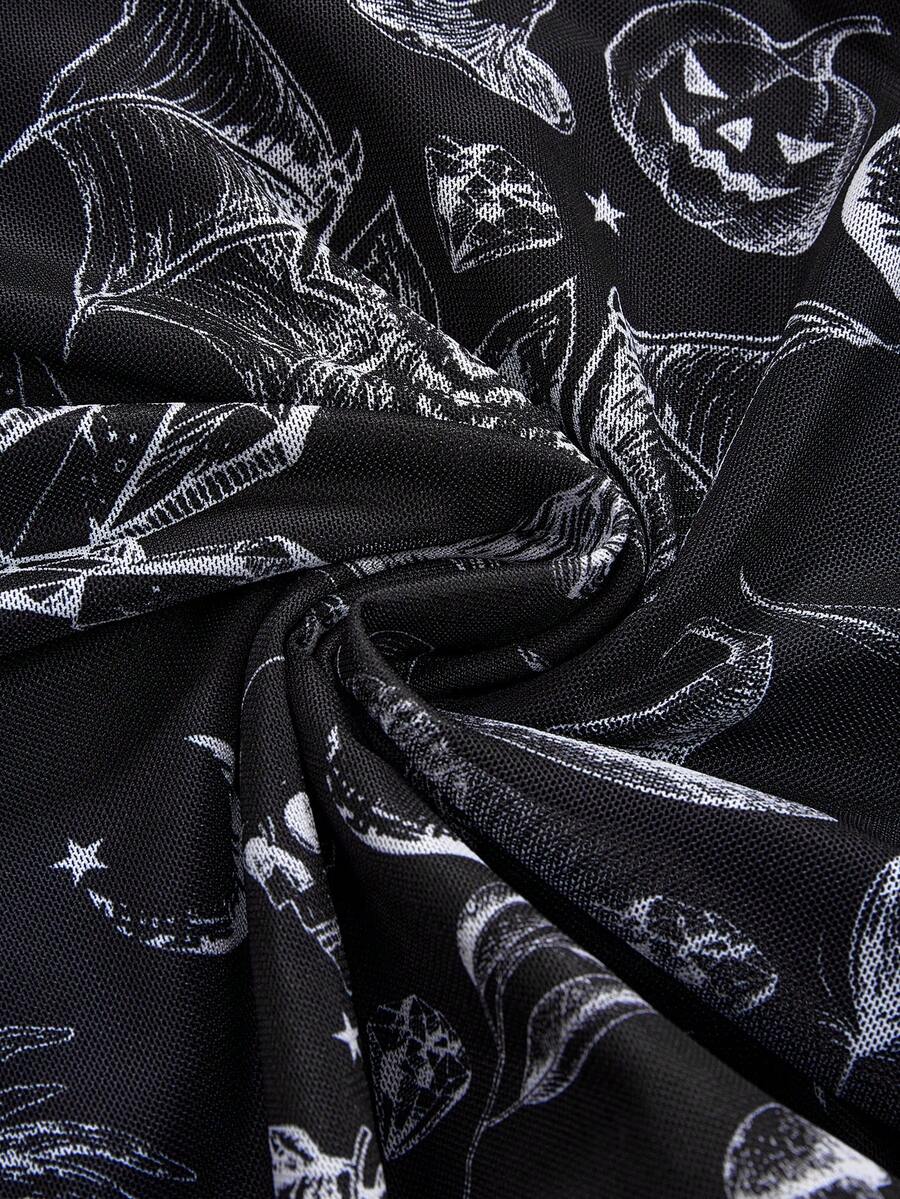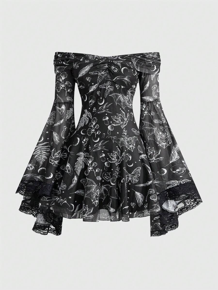 Goth Abito corto da donna in stile retrò romantico gotico con stampa di teschi, pipistrelli e piante, scollo spalle scoperte, maniche a sbuffo, orlo asimmetrico e dettagli in pizzo