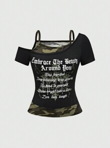 Maglietta da donna estiva casual con colletto asimmetrico e stampa mimetica, Abbraccia la bellezza che ti circonda, rimani fiducioso, continua a credere, continua a crescere, sii gentile con te stesso, brillare come una stella, vivere, amare, ridere, Scuola