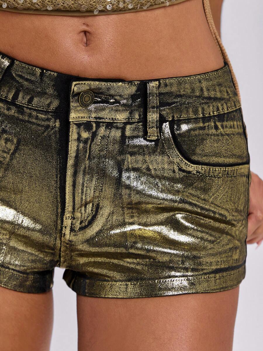 Shorts di jeans mini vita bassissima con dettagli in lamina d'oro, stile Y2K baddie alla moda per donne