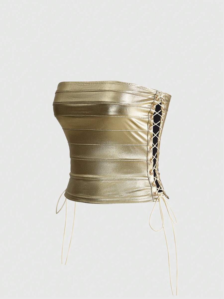 Y2K Top fasciante da donna in tessuto speciale dorato con laccetti laterali, adatto per festival musicali, feste, concerti, vacanze, appuntamenti e uscite casual