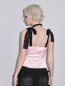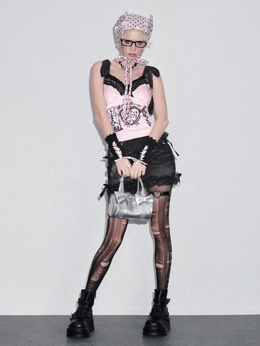 ROMWE Avant Canotta con lacci e fiocco in pizzo patchwork, per donna, con scritta Y2K Baddie Cat Cross Heart Castle Church Cyber​Rune Thorns Vines