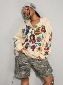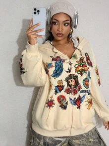 Street Life Felpa oversize con stampa colorata della Vergine Maria e croce, stile da strada Y2K per Ognissanti, taglie comode