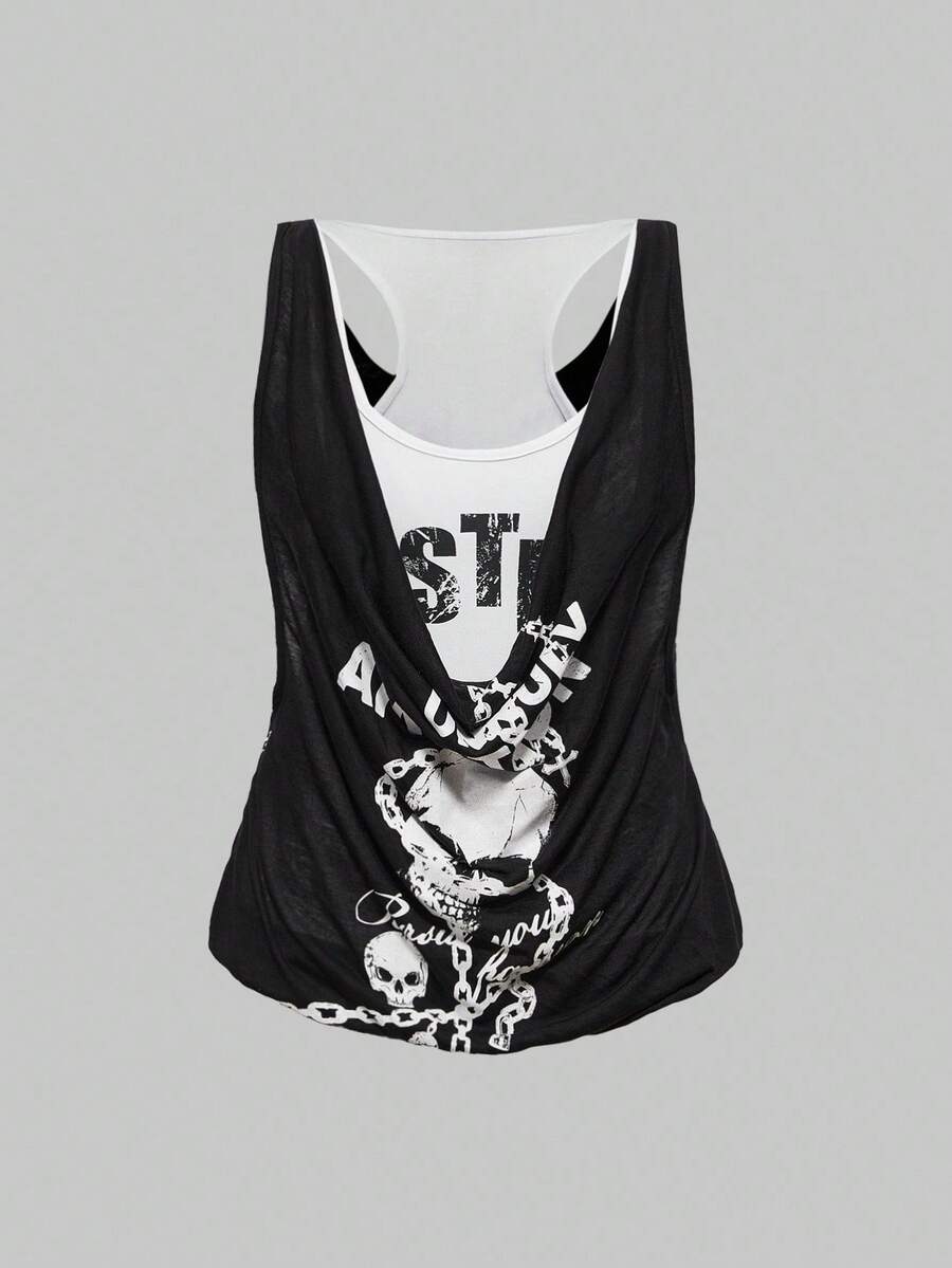 Grunge Punk Top con incrocio sulla schiena, stampa teschio, balze a strati, stile Y2K Harajuku Goth Punk