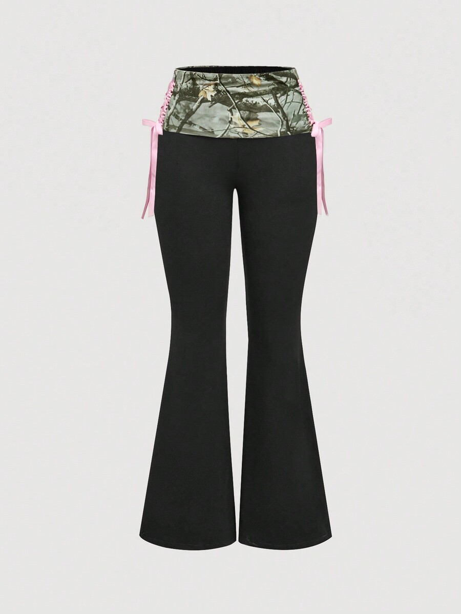 Top a canotta con fiocco in vita e stampa mimetica per donna, pantaloni skinny a zampa con vita bassa nello stile Y2K