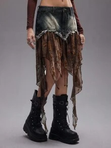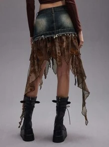 Grunge Punk Gonna di jeans mini asimmetrica con arricciature, applicazioni floreali e laccetti in stile retrò punk grunge per donne, in stile Y2K