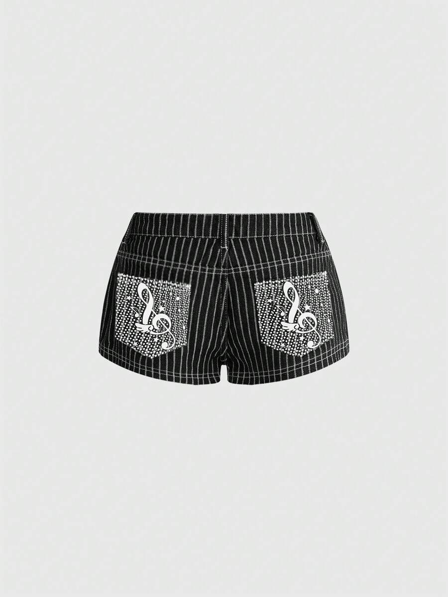 Pantaloncini di jeans a vita bassa con righe e note musicali ricamate in stile retrò Y2K