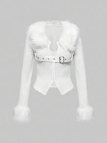 EDITION Cardigan aderente da donna con colletto in pelliccia e design occhiellato, in stile romantico punk Y2K