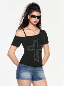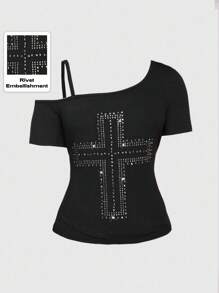Grunge Punk Maglietta da donna vintage Y2K sexy con spalle scoperte, decorata con rivetti a croce, di colore unito e versatile