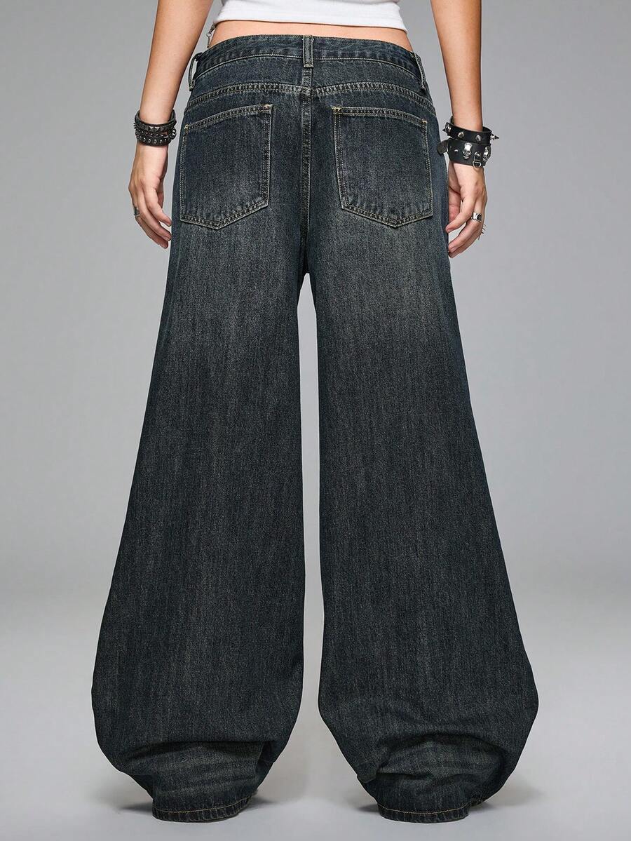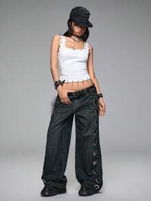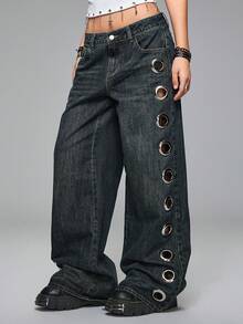 Grunge Punk Jeans vintage lavati Y2K a vita bassa super ampi con fori laterali con occhielli