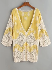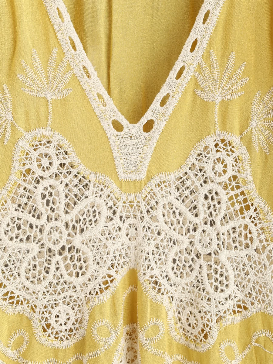 Giallo con scollo a V ricamata Occhiello Crochet Lace Cover Up