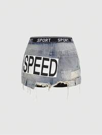 ROMWE Avant Minigonna di jeans da donna in stile Y2K con toppe ricamate con slogan
