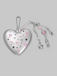 Kawaii 1 pezzo Specchio per trucco portatile in pelle sintetica rosa con stampa a fiocco e a forma di cuore, stampa assortita