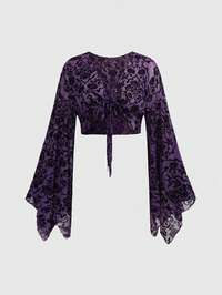 Fairycore Blusa corta elegante con maniche a campana, in tessuto floccato e rete, per taglie comode