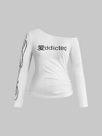 Goth Maglietta over asimmetrica con stampa gotica vintage del teschio e rosa sulla spalla, taglia comoda
