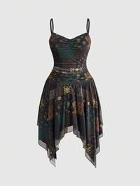 Fairycore Abito sottoveste sexy con stampa floreale gotica, teschio, sole e luna, taglie comode