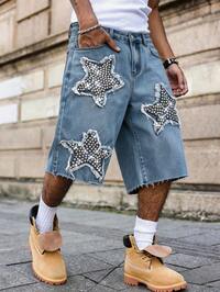 Pantaloncini di jeans pesanti e lavati, con ricamo a stelle, effetto vissuto. Pantaloni casual da uomo con vestibilità morbida e decorazioni in strass.