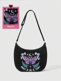 Fairycore Tipo di fiore: Borsa a tracolla obliqua di alta qualità con ricamo di teschio, falena, foglia, stella, luna, magia, diavolo, stile gotico