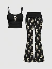 Goth Set da 2 pezzi da donna composto da maschera scura gotica, canotta sexy con arricciature e pantaloni a zampa a vita bassa