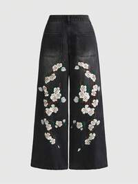 Grunge Punk Jeans a gamba ampia casual lavati con ricamo floreale