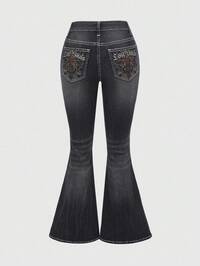ROMWE Avant Jeans a vita bassa a zampa d'elefante da donna con ricamo retrò di sottoculturaVergine Maria, teschio, ali e tigre