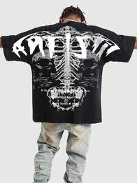 Prep Maglietta a maniche corte oversize da uomo, stile gotico, con stampa di lettere e scheletro, adatta per Ognissanti